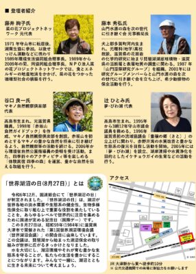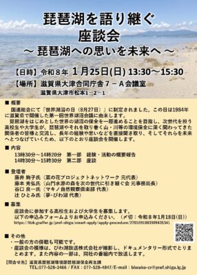 滋賀県では、令和6年(2024年)12月に、国連において「世界湖沼の日(8月27日)」が制定されたことを踏まえ、琵琶湖をはじめとした世界の湖沼の保全を一層進めることを目指し、次世代を担う高校生や大学生が、琵琶湖やそれを取り巻く山・川等の環境保全に深く関わってきた関係者の皆様と交流し、長年の経験や思いなどを直接聞き取り、そしてそれらを未来へとつなげていくため、以下のような座談会を開催するそうです。