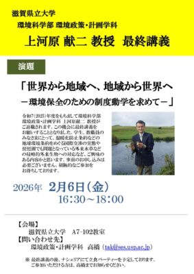令和7(2025)年度をもちまして環境科学部環境政策・計画学科上河原献二教授がご退職されます。この機会に最終講義をお願いすることとなりました。学生、教職員のみなさまにとって、国際交渉の実態や外来生物への対応など、ご興味のある内容かと思います。事前のお申し込みは必要ございません。積極的なご参加をお待ちしております。